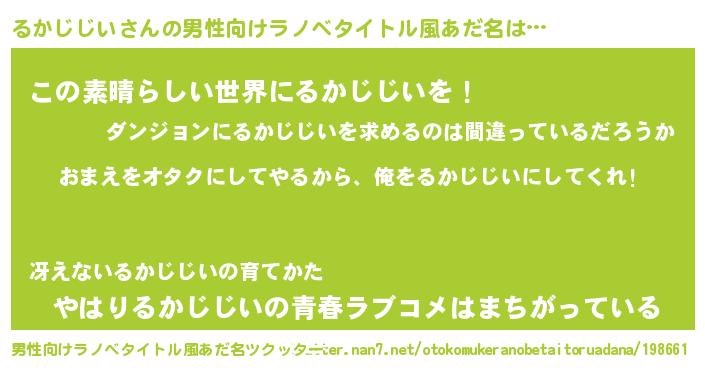 | 女子向けラノベタイトル風あだ名 | 『るかじじい夫妻のなれそめ』 |