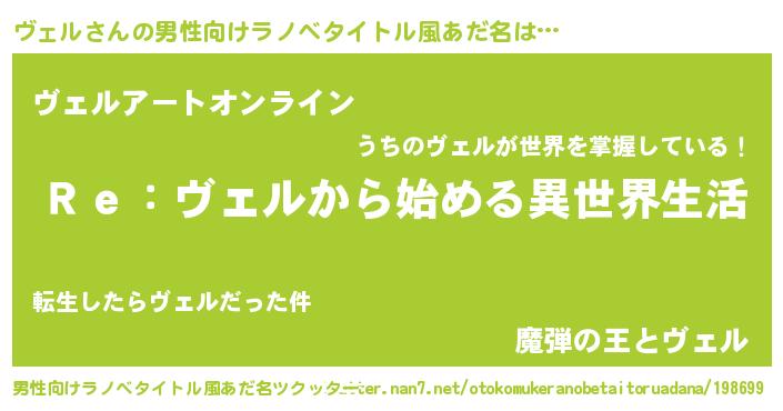 | 女子向けラノベタイトル風あだ名 | 『闇のヴェル』『男装ヴェルの憂鬱な任務』 |