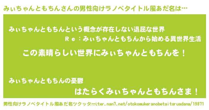 | 女子向けラノベタイトル風あだ名 | 『悪役みぃちゃんともちんに転生したようですが、知った事ではありません』 |
