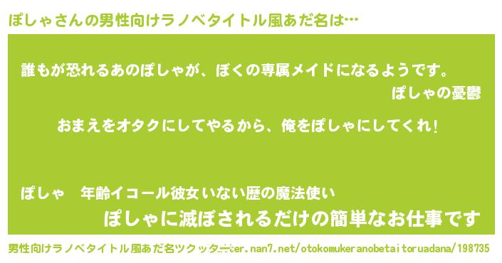 | 女子向けラノベタイトル風あだ名 | 『ぽしゃ夫妻のなれそめ』 |