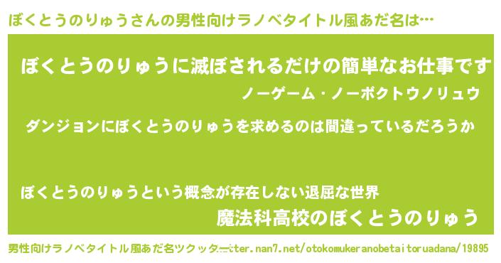 | 胡散臭い通販商品みたいなあだ名 | 『伝統あるサプリメント…その名も「ぼくとうのりゅう」』 |