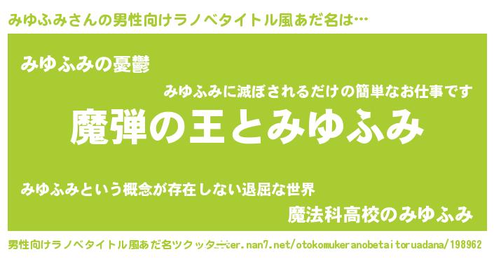 女子向けラノベタイトル風あだ名 | 『乙女ゲームの破滅フラグしかない悪役みゆふみに転生してしまった…』 |