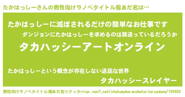 | 女子向けラノベタイトル風あだ名 | 『誰かこのたかはっしーを説明してください! ~契約から始まるウェディング~』 |