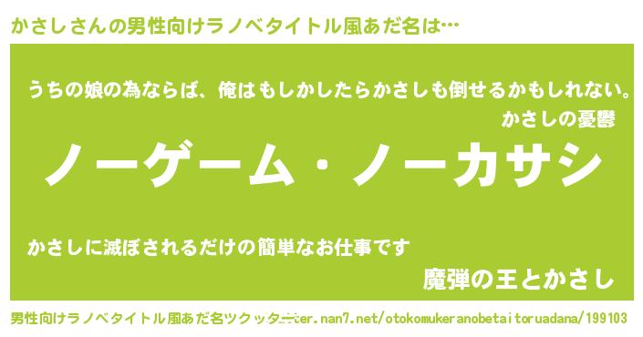 | 女子向けラノベタイトル風あだ名 | 『死神かさしの再婚』『かさし伯爵の花嫁』 |