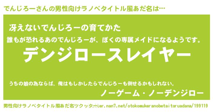 | 女子向けラノベタイトル風あだ名 | 『婚約破棄系悪役でんじろーに転生したので、保身に走りました。』 |