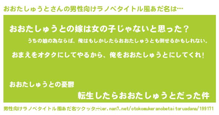 | 女子向けラノベタイトル風あだ名 | 『おおたしゅうと夫妻のなれそめ』 |