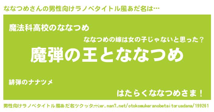 | 女子向けラノベタイトル風あだ名 | 『ななつめが死なない童話 林檎のななつめの診療簿』 |
