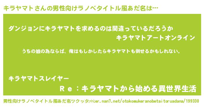 女子向けラノベタイトル風あだ名 | 『キラヤマトの婚約者』『闇のキラヤマト』 |