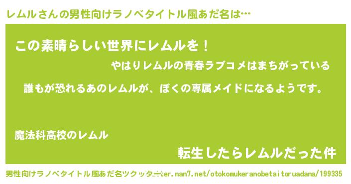 | 胡散臭い通販商品みたいなあだ名 | 『来世でも幸せになれる水素水…その名も「レムル」』 |
