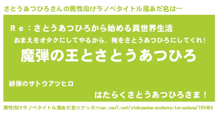 | 女子向けラノベタイトル風あだ名 | 『乙女ゲームの破滅フラグしかない悪役さとうあつひろに転生してしまった…』 |