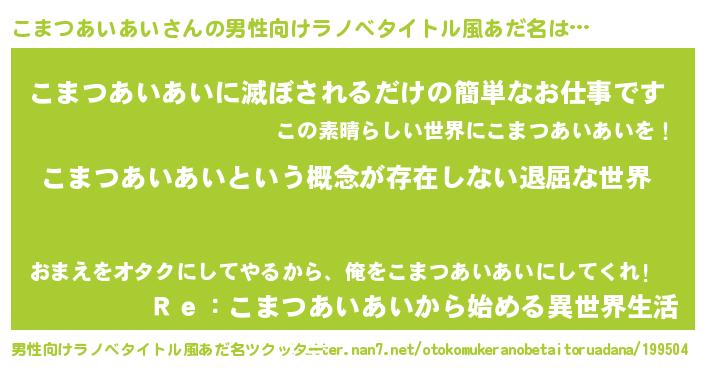 | 女子向けラノベタイトル風あだ名 | 『異世界で失敗しない100のこまつあいあい』 |