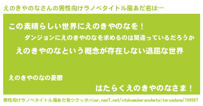 | 女子向けラノベタイトル風あだ名 | 『異世界で失敗しない100のえのきやのな』 |