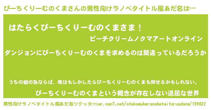 | 女子向けラノベタイトル風あだ名 | 『ぴーちくりーむのくまの卵を拾いまして』 |
