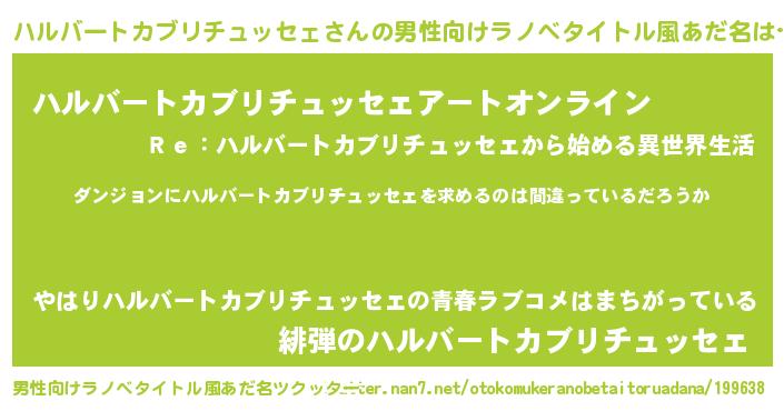 | 女子向けラノベタイトル風あだ名 | 『ハルバートカブリチュッセェは平凡を望む』 |