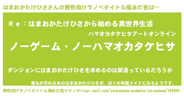 | 女子向けラノベタイトル風あだ名 | 『死神はまおかたけひさの再婚』 |
