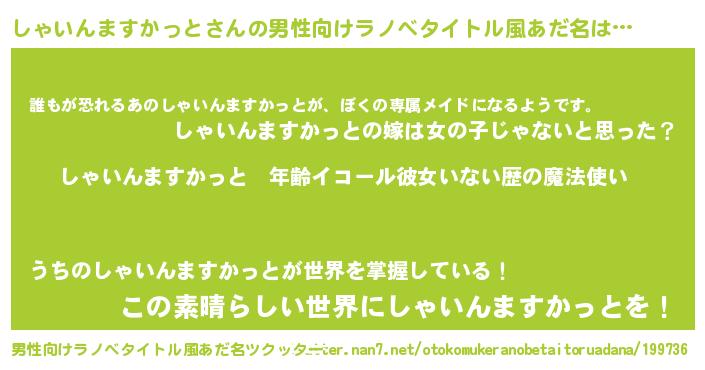 | 女子向けラノベタイトル風あだ名 | 『しゃいんますかっとの玉の輿計画!』 |