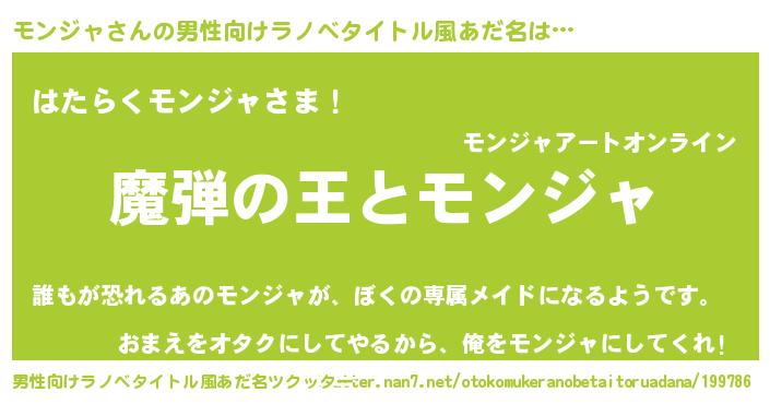 | 女子向けラノベタイトル風あだ名 | 『モンジャが死なない童話 林檎のモンジャの診療簿』 |