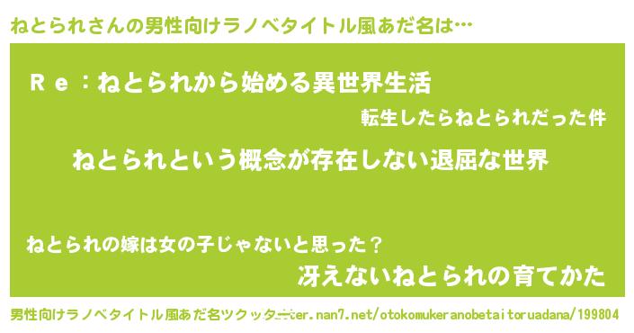 | 女子向けラノベタイトル風あだ名 | 『異世界で失敗しない100のねとられ』 |