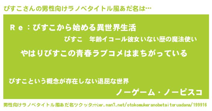 | 女子向けラノベタイトル風あだ名 | 『ぴすこの雑貨屋さん』『闇のぴすこ』 |