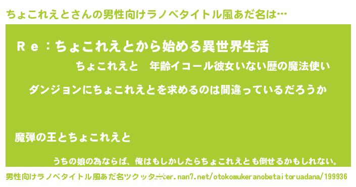 | 女子向けラノベタイトル風あだ名 | 『ちょこれえとの卵を拾いまして』 |