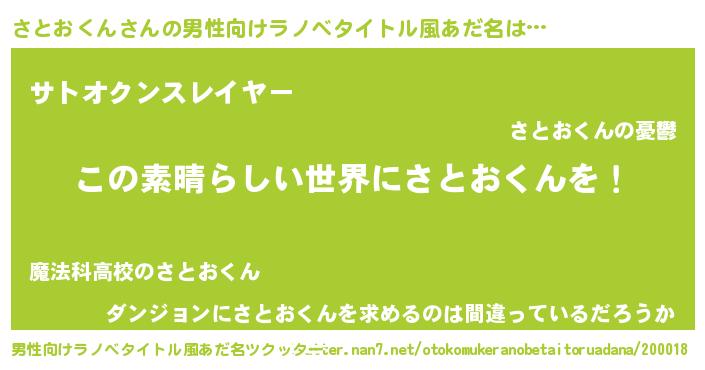 | 女子向けラノベタイトル風あだ名 | 『悪役さとおくんに転生したようですが、知った事ではありません』 |