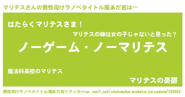 | 女子向けラノベタイトル風あだ名 | 『死神マリテスの再婚』 |