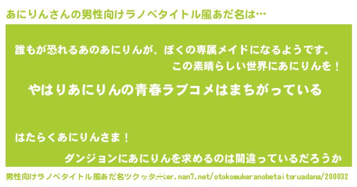 | 女子向けラノベタイトル風あだ名 | 『あにりん伯爵の花嫁』 |