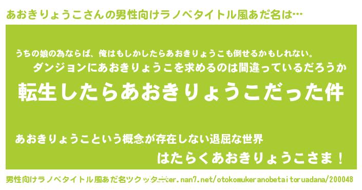 | 女子向けラノベタイトル風あだ名 | 『あおきりょうこの玉の輿計画!』 |
