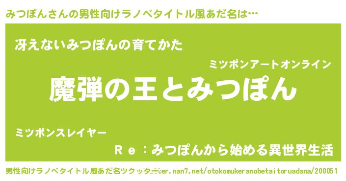 | 女子向けラノベタイトル風あだ名 | 『みつぽんが死なない童話 林檎のみつぽんの診療簿』 |