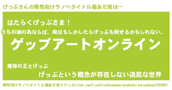 | 胡散臭い通販商品みたいなあだ名 | 『億万長者になれるブレスレット…その名も「げっぶ」』 |