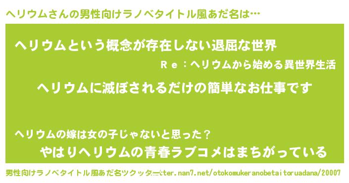 | 胡散臭い通販商品みたいなあだ名 | 『来世でも幸せになれる水素水…その名も「ヘリウム」』 |