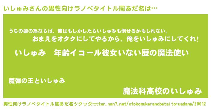 | 女子向けラノベタイトル風あだ名 | 『いしゅみの玉の輿計画!』 |