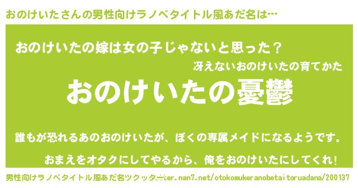 | 女子向けラノベタイトル風あだ名 | 『(仮)おのけいたのやんごとなき事情』 |