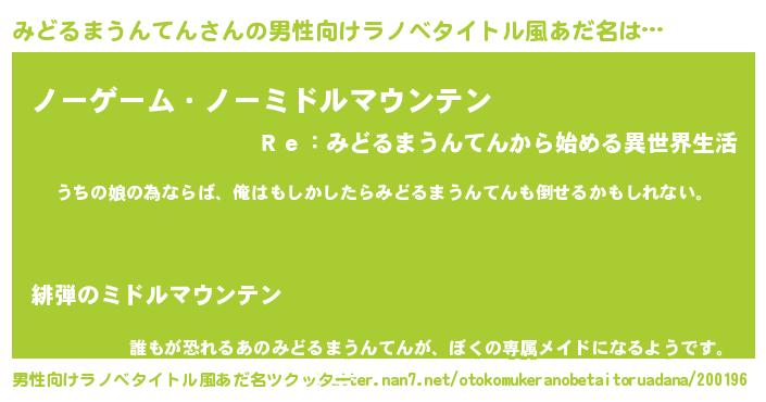| 女子向けラノベタイトル風あだ名 | 『みどるまうんてん伯爵の花嫁』 |