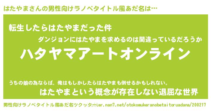 | 胡散臭い通販商品みたいなあだ名 | 『億万長者になれるブレスレット…その名も「はたやま」』 |