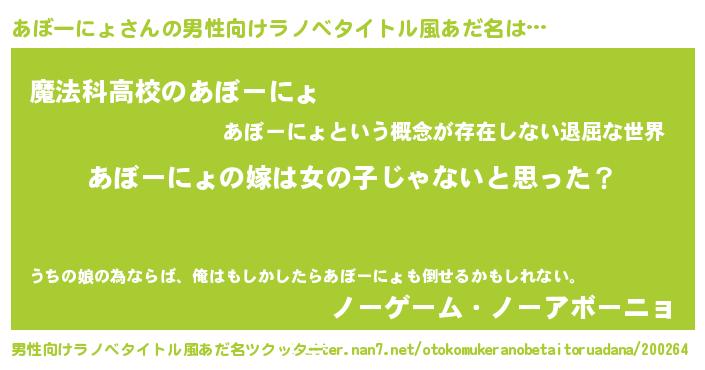 | 女子向けラノベタイトル風あだ名 | 『あぼーにょの卵を拾いまして』 |