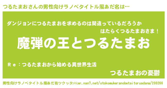 | 女子向けラノベタイトル風あだ名 | 『つるたまおが死なない童話 林檎のつるたまおの診療簿』 |