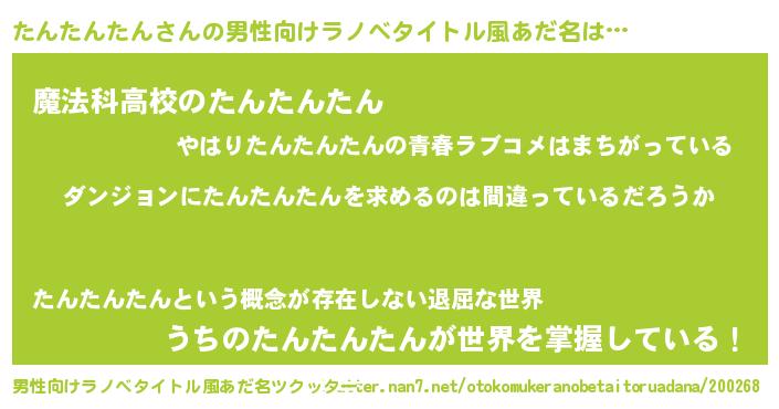 | 女子向けラノベタイトル風あだ名 | 『たんたんたんの卵を拾いまして』 |