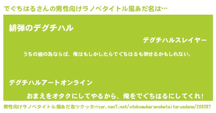 | 女子向けラノベタイトル風あだ名 | 『でぐちはるの婚約者』 |