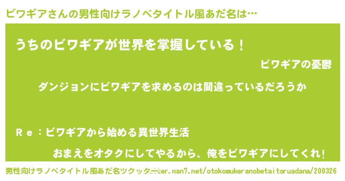 | 胡散臭い通販商品みたいなあだ名 | 『信頼と実績のサプリメント…その名も「ビワギア」』 |