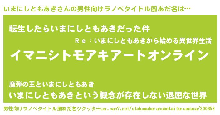 | 女子向けラノベタイトル風あだ名 | 『誰かこのいまにしともあきを説明してください! ~契約から始まるウェディング~』 |