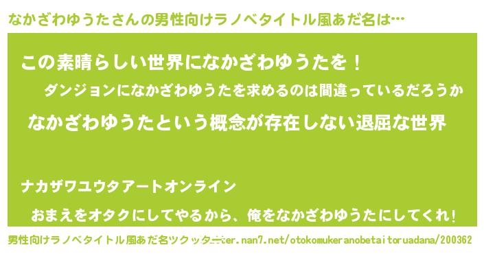 | 女子向けラノベタイトル風あだ名 | 『異世界で失敗しない100のなかざわゆうた』 |