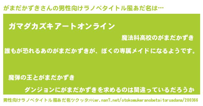 | 女子向けラノベタイトル風あだ名 | 『がまだかずきの契約王妃』 |
