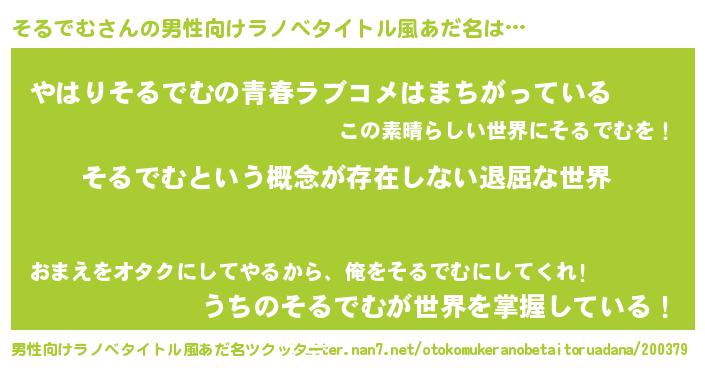 | 女子向けラノベタイトル風あだ名 | 『異世界で失敗しない100のそるでむ』 |