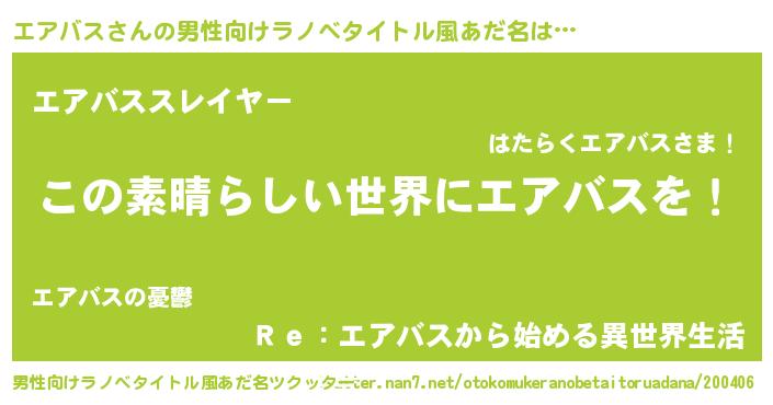| 女子向けラノベタイトル風あだ名 | 『悪役エアバスに転生したようですが、知った事ではありません』 |