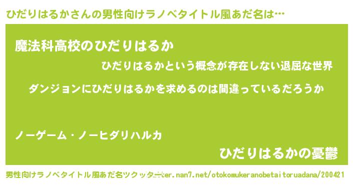 女子向けラノベタイトル風あだ名 | 『ひだりはるかは平凡を望む』 |