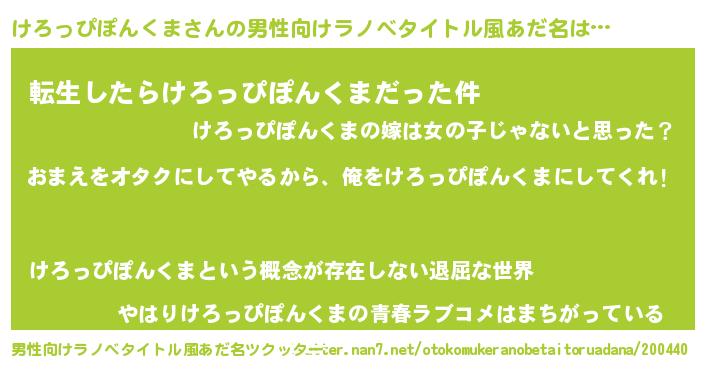 | 女子向けラノベタイトル風あだ名 | 『けろっぴぽんくま夫妻のなれそめ』 |
