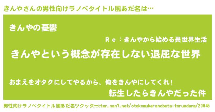 | 女子向けラノベタイトル風あだ名 | 『異世界で失敗しない100のきんや』 |