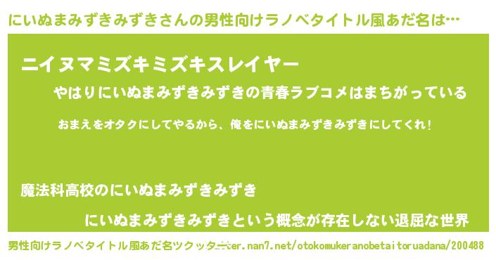 | 女子向けラノベタイトル風あだ名 | 『にいぬまみずきみずき夫妻のなれそめ』 |