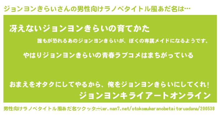 | 女子向けラノベタイトル風あだ名 | 『ジョンヨンきらいの雑貨屋さん』 |
